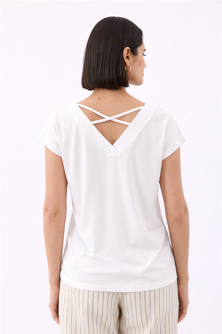 V Yaka Sırt Çapraz Biyeli T-Shirt Beyaz (26Y0193K1-142)